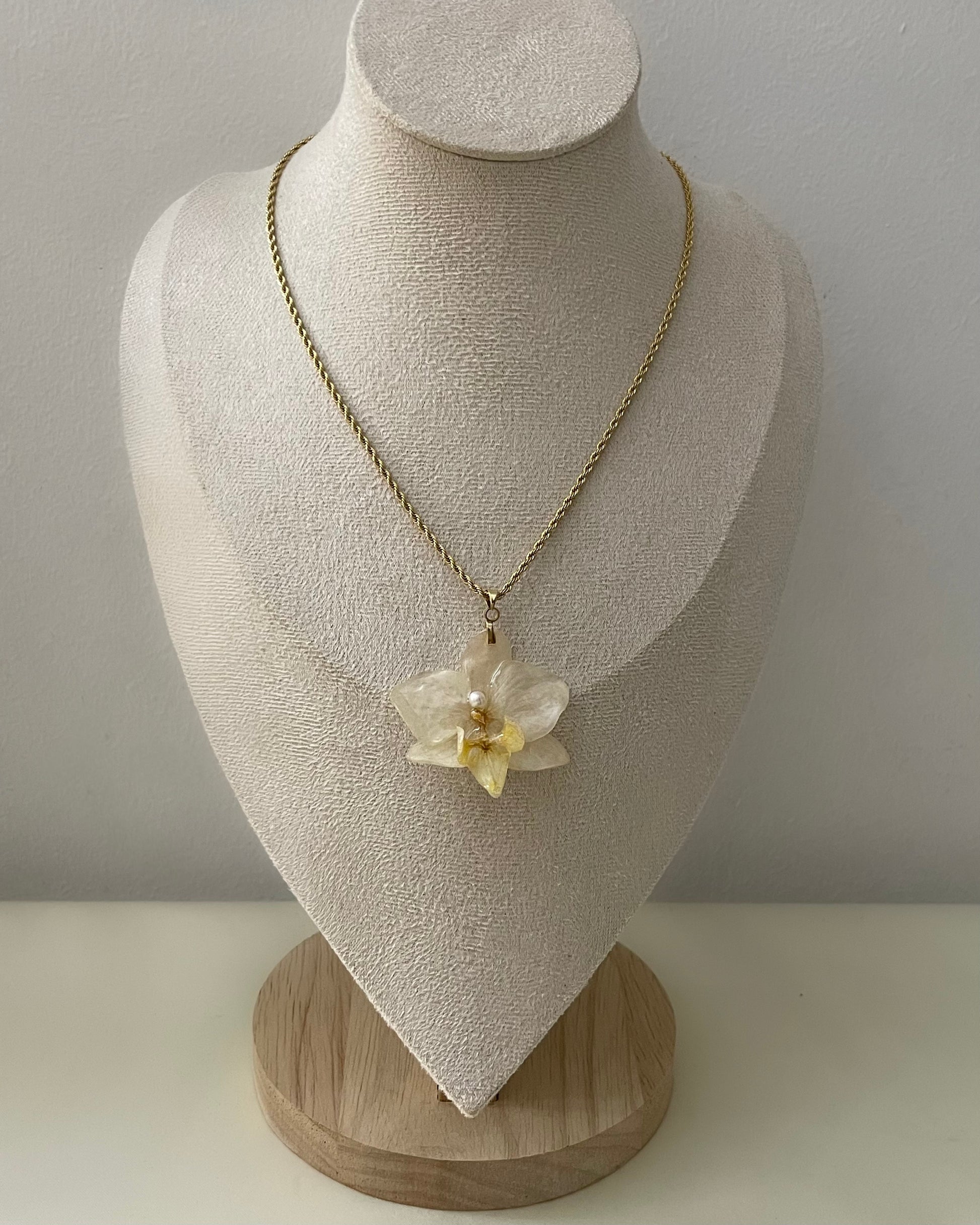 Orchidée naturelle résinée, perle d’eau douce et chaîne en acier inoxydable